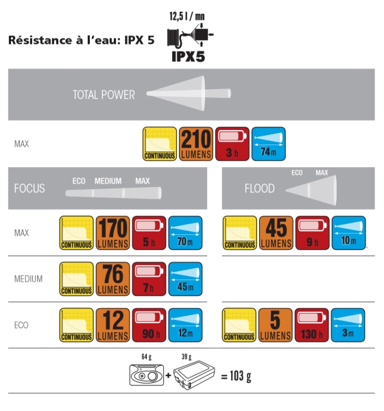 Avec 210 lumens en mode Total Power (pression des 2 boutons), une portée jusqu'à 74 m pour seulement