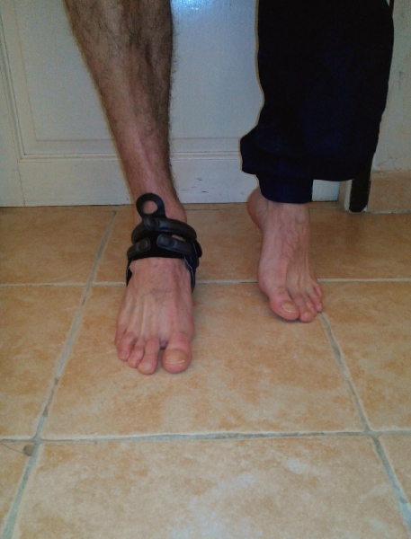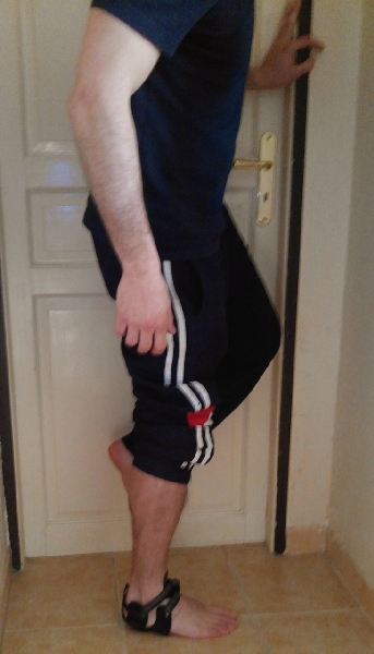 *exercice 4 : En position sur un pied equipé du MYOLUX SOFT, l'autre pied est maintenu en l'air, les mains en contact avec un mur. A partir d'une position pied en appui sur son bord exterieur, remonter le petit orteil en haut et en dehors puis l'ensemble de l'avant du pied, et redescendre en position initiale, genou tendu. La montée doit être la plus explosive possible (rapide) alors que la descente doit être la plus lente possible (travail excentrique).Le but est d 'effectuer 3 fois ce mouvement une dizaine de fois entrecoupées de 2mn de repos.