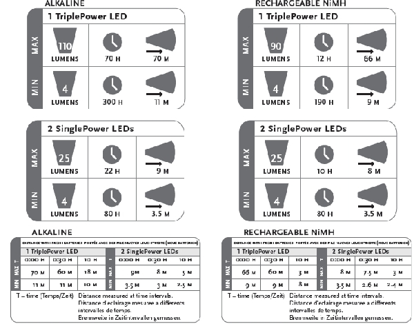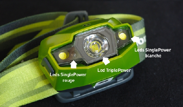 - 1 Led TriplePower, 2 Leds SinglePower blanches et 2 Leds SinglePower rouges émettent jusqu'à 110 lumens (réglage maxi utilisant des piles alcalines)